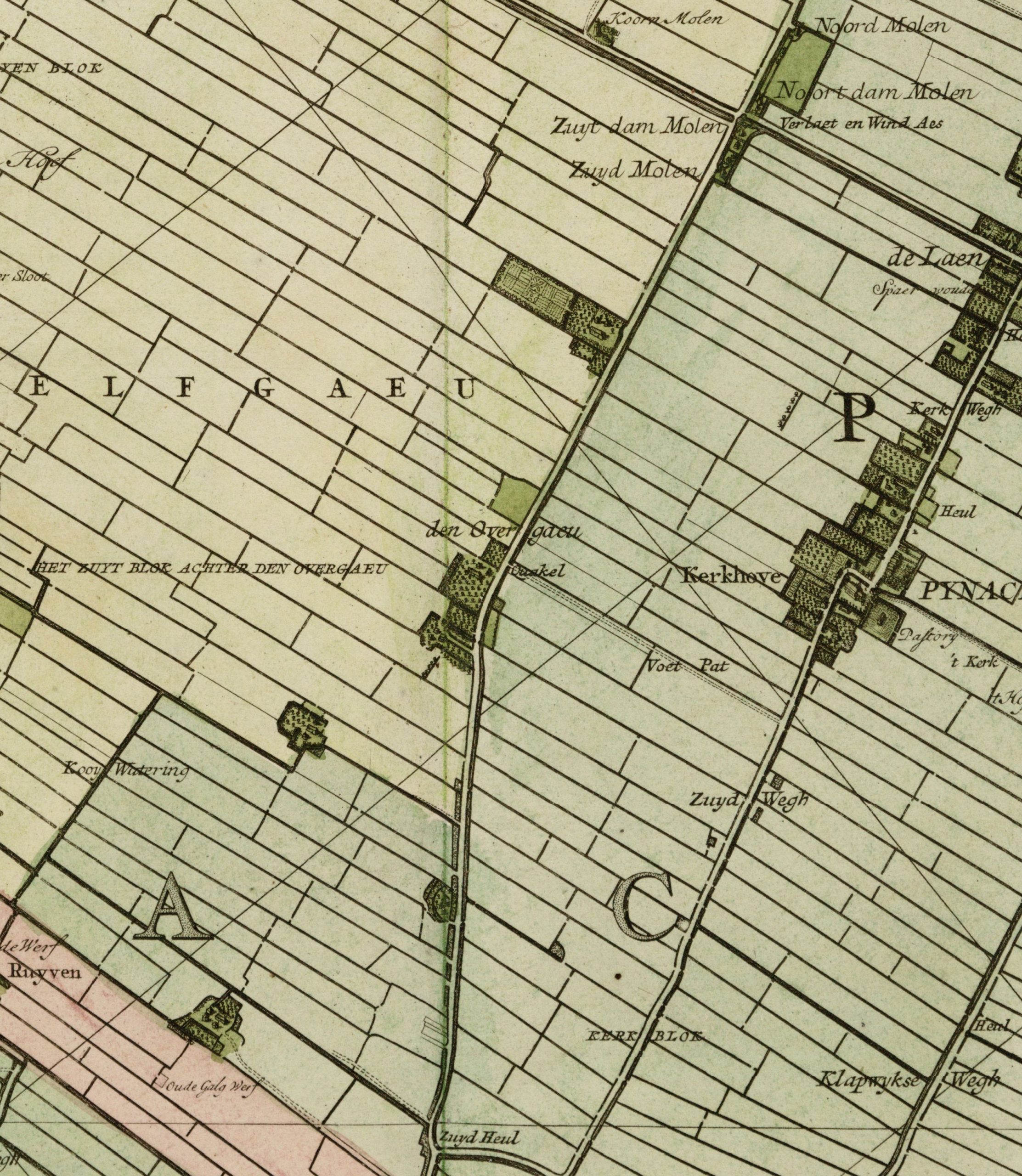 Op de kaart van Kruikius(‘Cruquius’) uit 1712 zijn enkele boerderijen al te zien langs ‘den Overgaeu’.