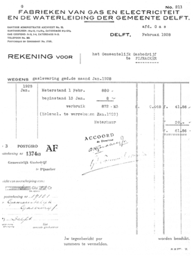 Gas laat nog enkele jaren op zich wachten, maar op 15 december 1927 laat prof. ir. Chr. K. Visser weten dat de Fabrieken van Gas en Elektriciteit en de Waterleiding der Gemeente Delft tot gaslevering aan de Gemeente Pijnacker gereed zijn. In de maand januari 1928 stromen de eerste kubieke meters naar de Pijnackerse verbruikers en wordt het Gemeentelijk Gasbedrijf te Pijnacker de rekening gepresenteerd (afb. no. 61). Radiodistributie