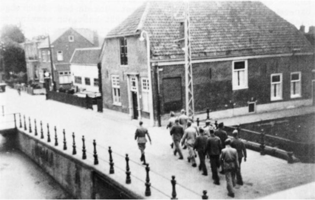 Afb. no. 64: Een patrouille Nederlandse soldaten, gelegerd in het CJMV-gebouw aan de Kerkweg, marcheert over de Laanbrug tijdens de mobilisatie in 1939-1940.
