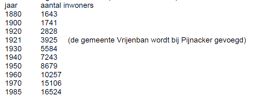 Om enige indruk te geven van de groei van de Pijnackerse bevolking in de laatste 100 jaar, drukken we het volgend overzicht af (zie ook afb. no. 59):
