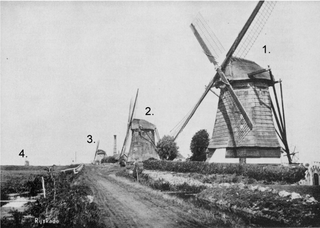 Van voor naar achter: 1 . Zuidmolen, 2. Zuiddammolen, 3. Noordmolen en 4. de molen die als woning door de fam. J. Neeleman werd gebruikt en december 1974 is afgebroken.