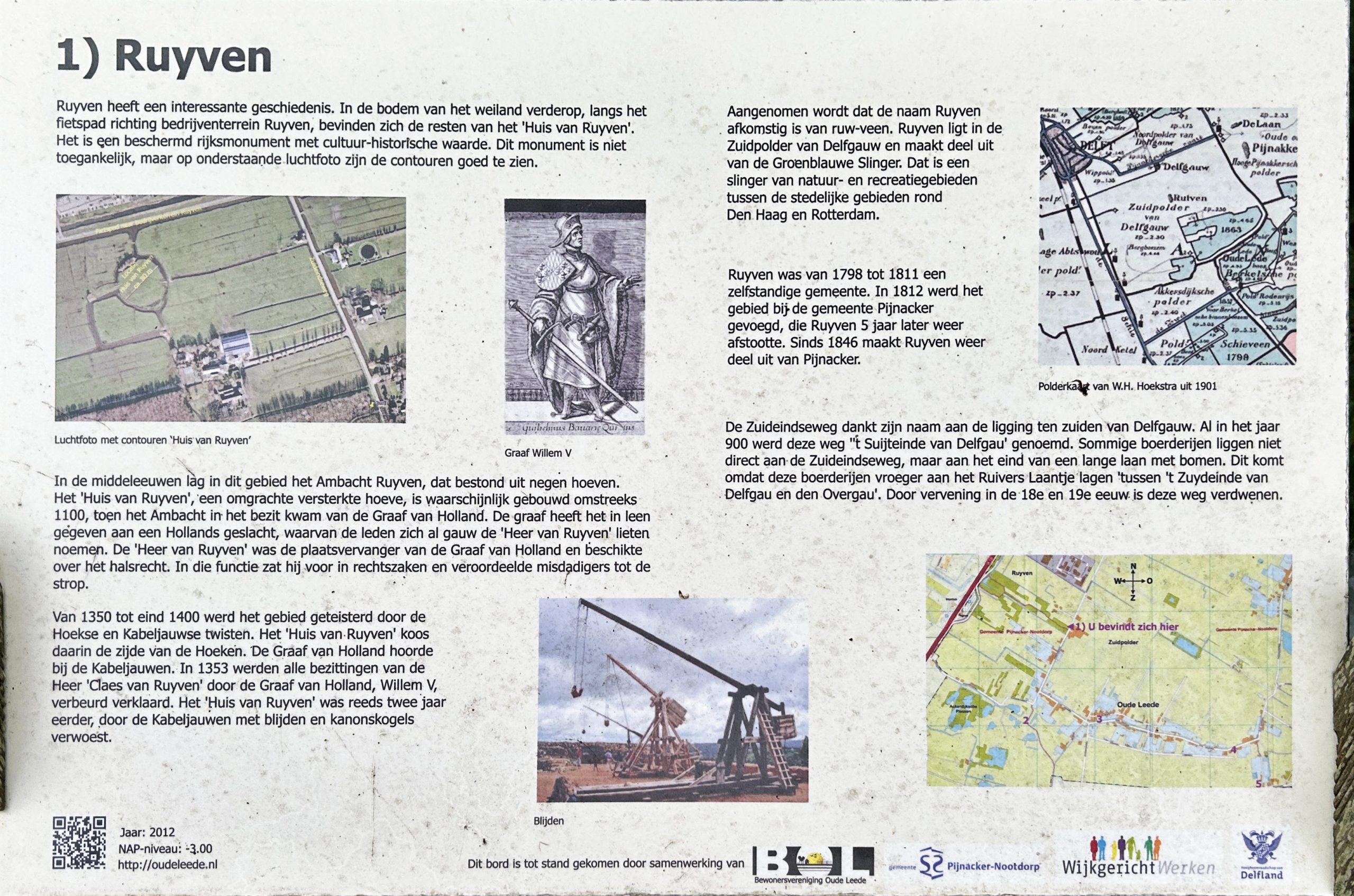 In de bodem van dit gebied bevindt zich een beschermd rijksmonument met cultuur/historische waarde. Dit monument is niet toegankelijk maar vanuit de lucht goed te zien. In de late middeleeuwen stond hier het ‘Huis van Ruiven’, een versterkte hoeve. De heer van Ruiven was de plaatsvervanger van de Graaf van Holland. Het Ambacht Ruiven was een hoge heerlijkheid. De Heer van Ruiven was bevoegd belangrijke rechtzaken te behandelen, waarbij de doodstraf kon worden uitgesproken. Hij beschikte over het ‘halsrecht’. Het ambacht bezat dan ook een galgwerf, waar deze vonnissen werden voltrokken.